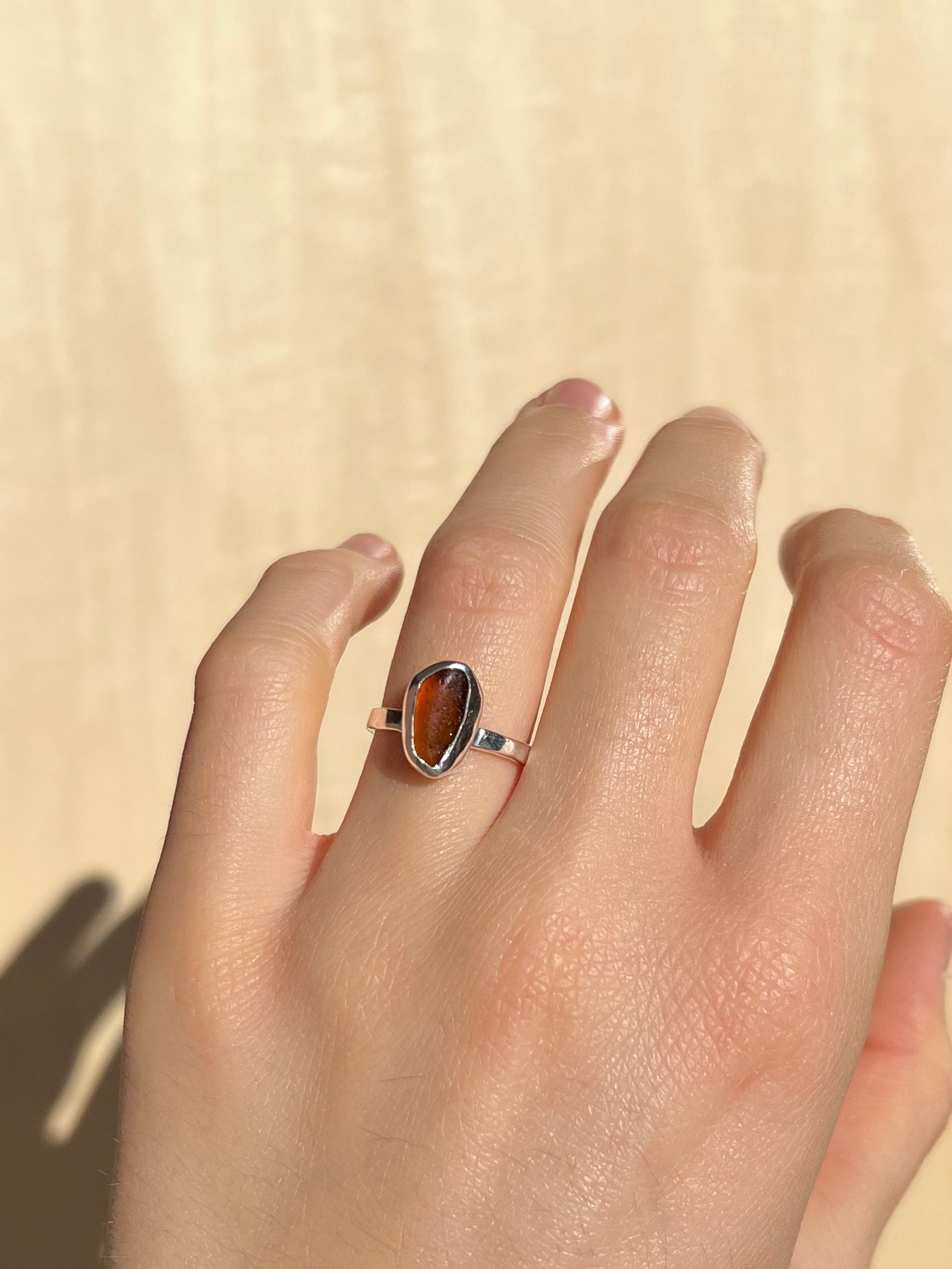 I found this piece of sea glass on Gran Canaria and lovingly crafted it into this silver ring. The ring band is hammered and 2 mm wide. The ring is size 52 (US: 6).