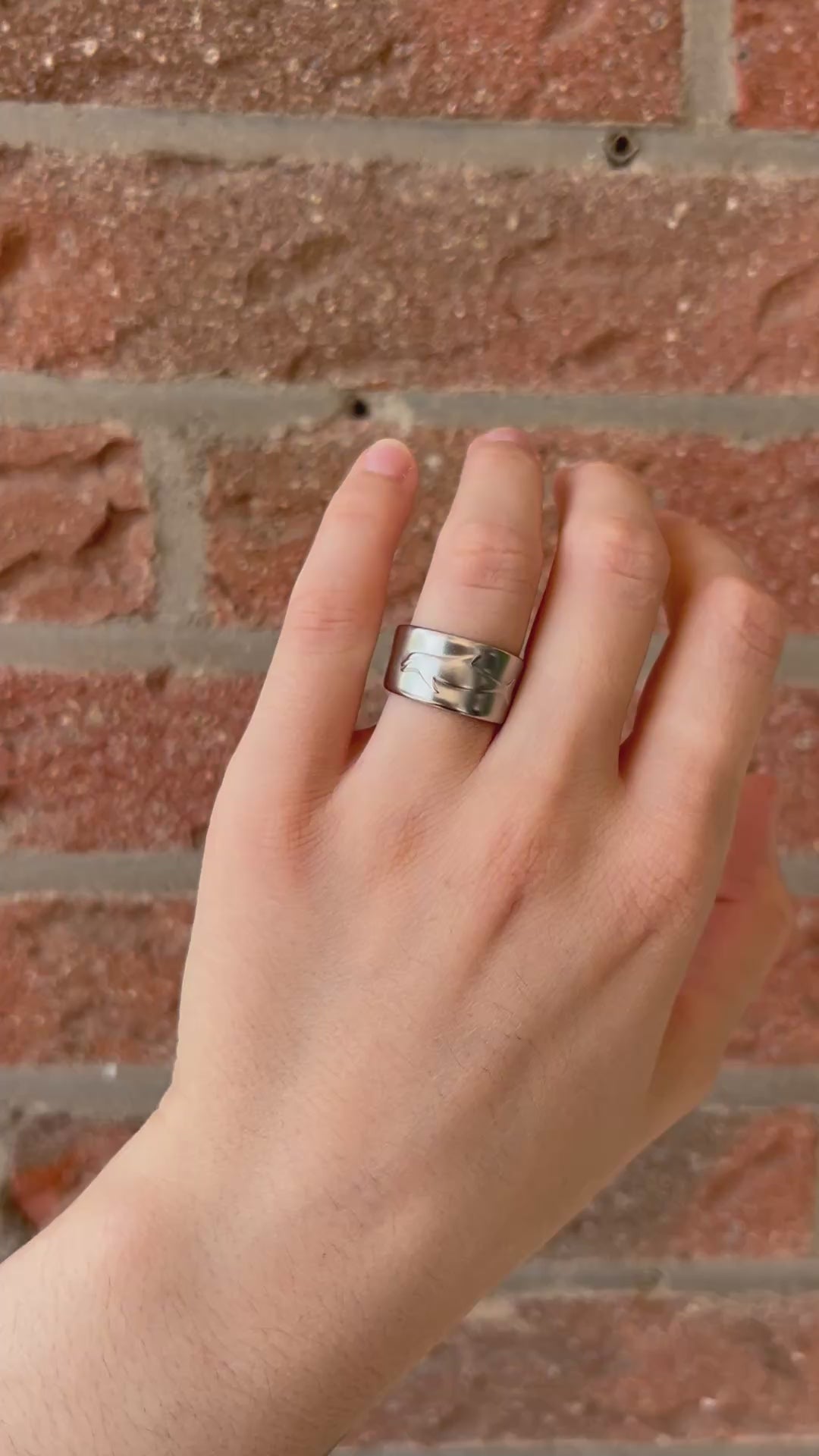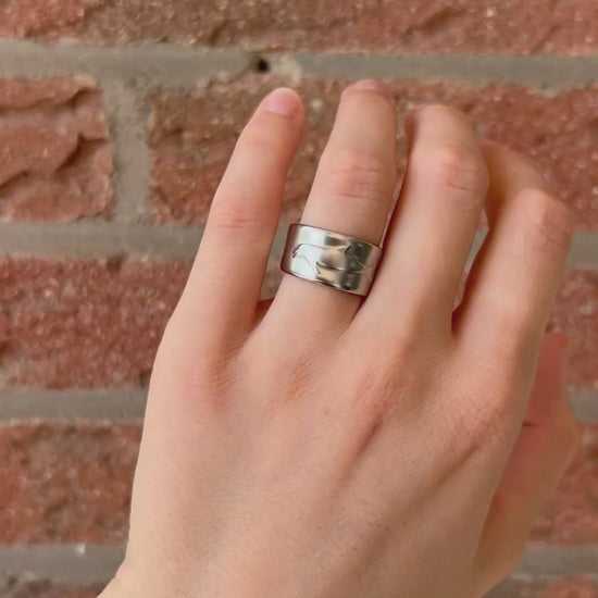 This ring is made from a stainless steel spoon and is size 52 (US: 6). It has a slight opening at the back, but is not adjustable due to the hard material.