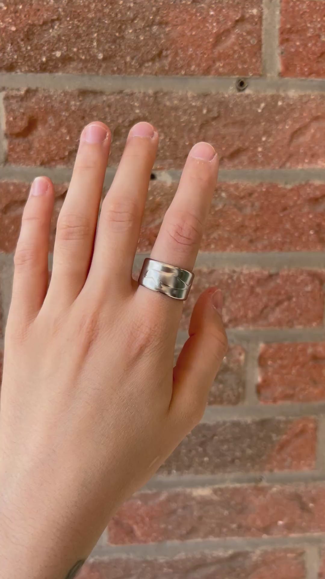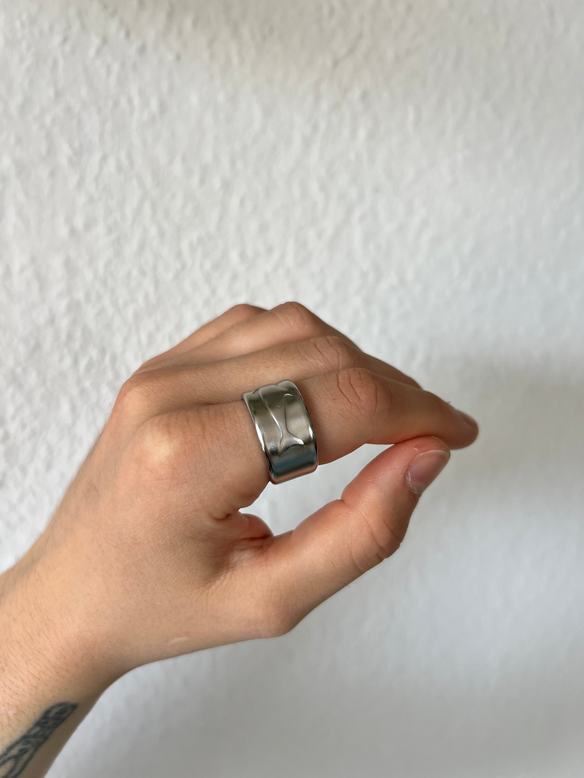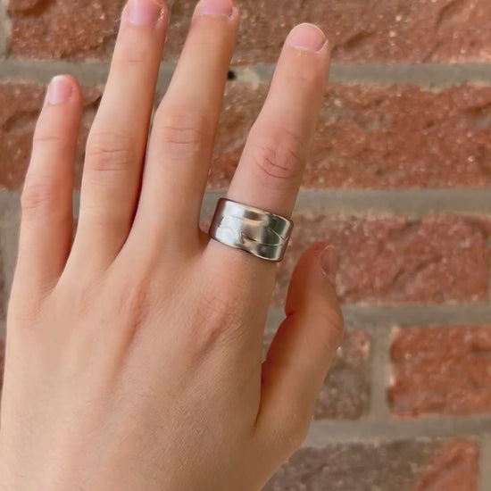 This ring is made from a stainless steel spoon and is size 58 (US: 8.5). It has a slight opening at the back, but is not adjustable due to the hard material.
