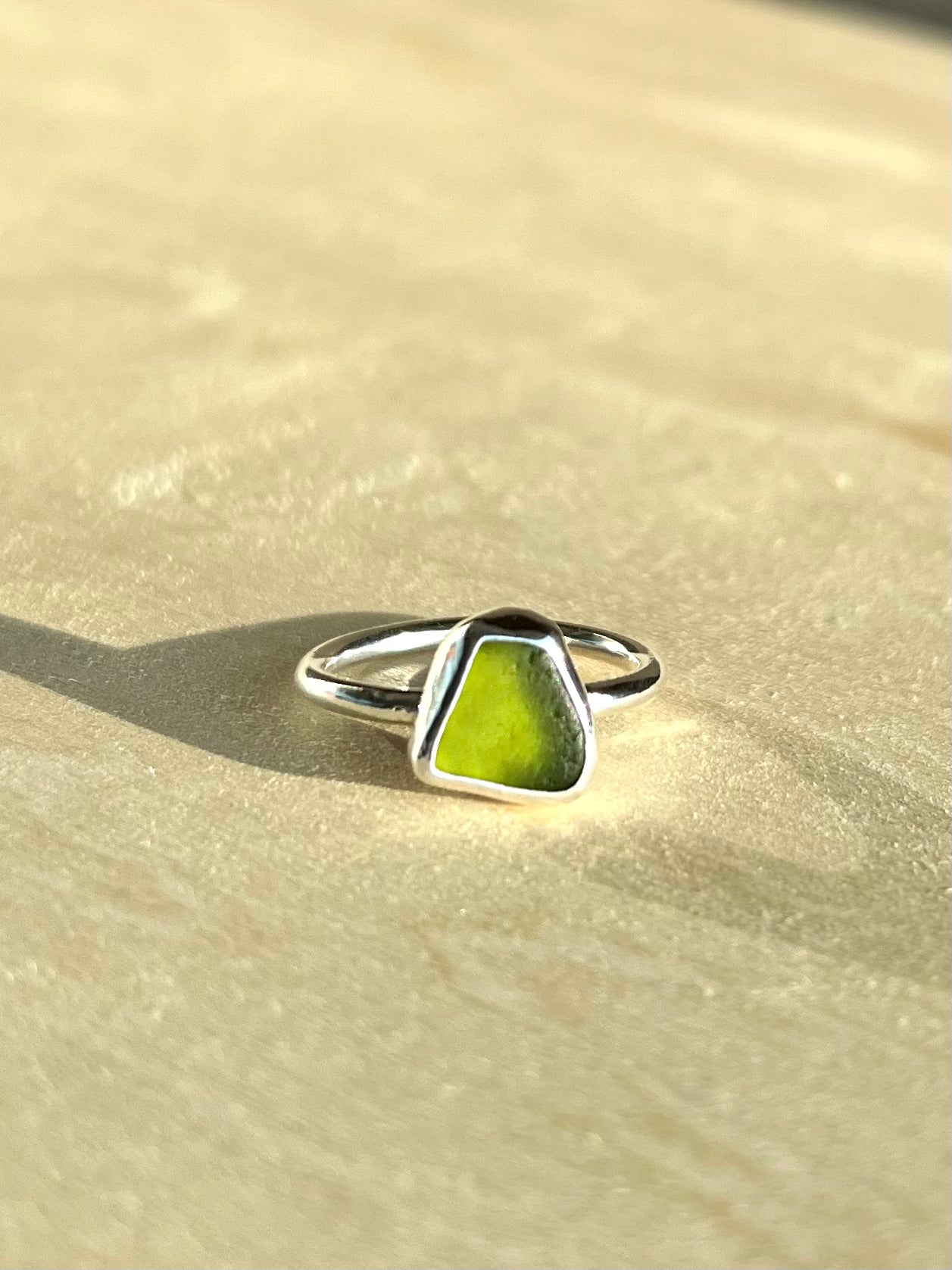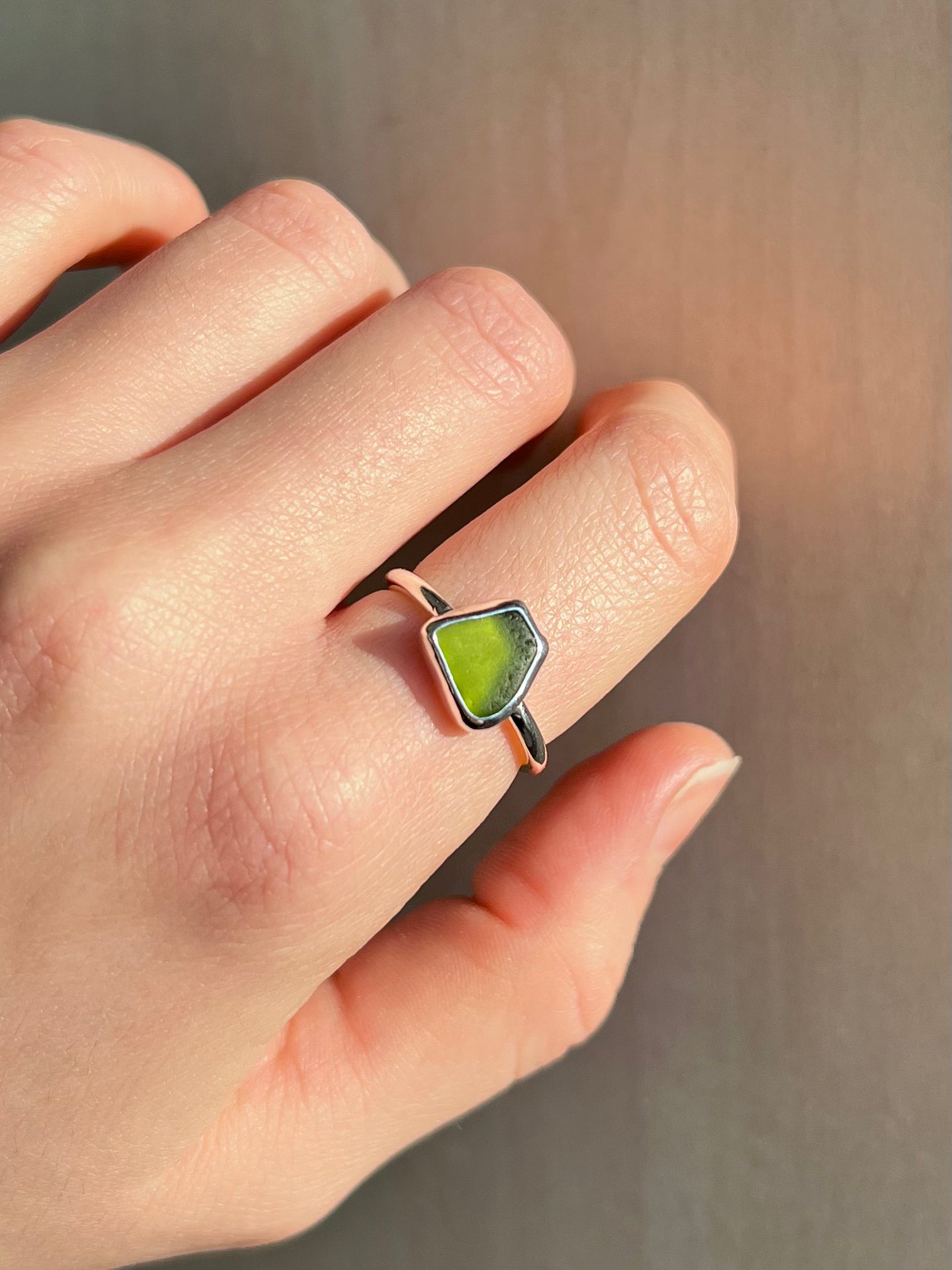 Dieses wunderschöne olivgrüne Meerglas habe ich auf Helgoland gefunden und mit viel Liebe zu einem Ring verarbeitet. Dabei wurde das Glas genauso belassen, wie es das Meer geformt und angespült hat.