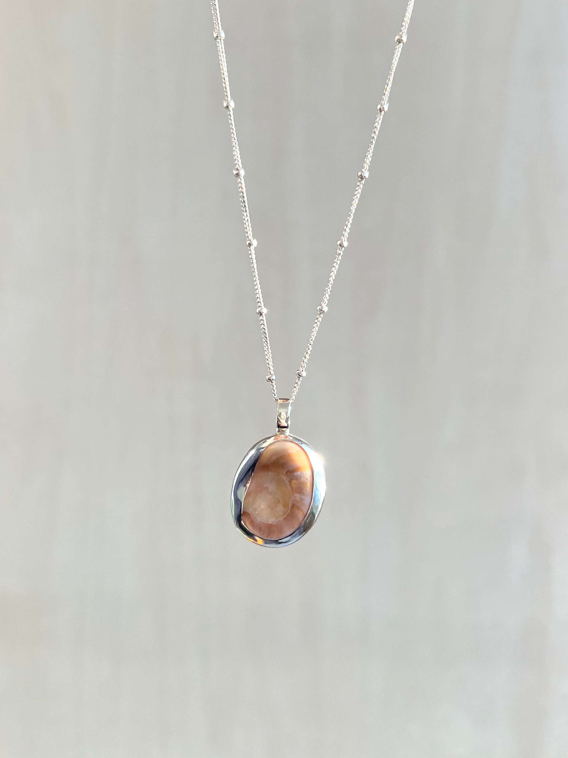 Das Shiva-Auge ist ein Fossil, und zwar das versteinerte Operculum einer Turbanschnecke. Mit viel Liebe habe ich dieses Fossil zu einem Anhänger mit offenem Rücken verarbeitet, damit es in voller Gänze zur Geltung kommen kann.